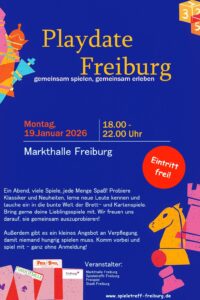 Spielen verbindet! Am 19. Januar 2026 von 18 bis 22 Uhr laden wir herzlich zum Playdate in der Markthalle Freiburg ein. Ein offener Spieletreff für alle, die Lust auf Gemeinschaft, Spiel und neue Begegnungen haben. Bringt eure Lieblingsspiele mit oder entdeckt Neues! Die Teilnahme ist kostenlos und ohne Anmeldung. Für Snacks und Getränke ist gesorgt. Kommt vorbei und erlebt einen spielerischen Abend voller Spaß und Austausch!